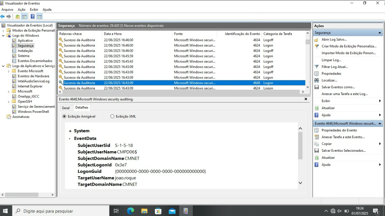 - Registros do Windows Event Viewer (Evento 4648 – logon explícito)